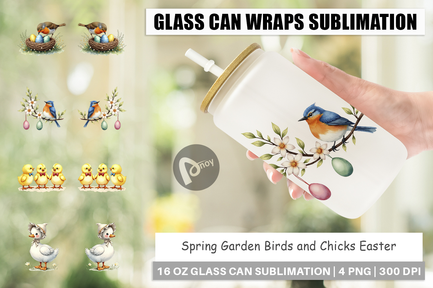 Sublimation Designs Diy Gift Idea Libbey Glass Sublimation Glass Can Wrap Png Gardener Gift Idea Printable Glass Can Spring Garden Birds Easter Chicks Glass Can Garden Theme Wrap Cute Birds Glass
