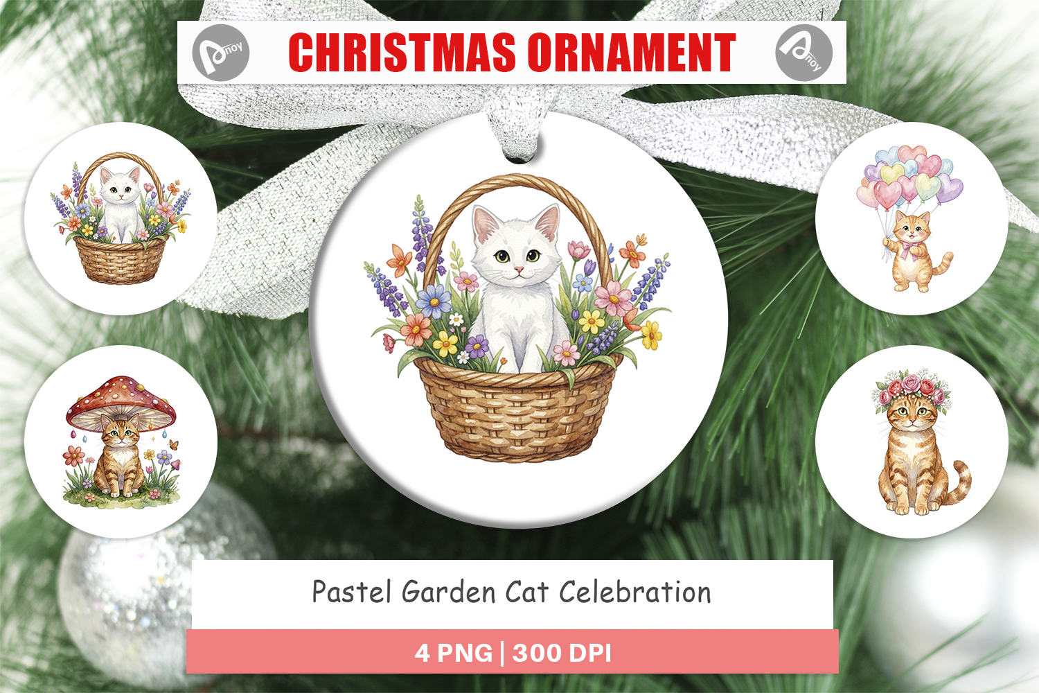 Christmas Ornament Sublimation Designs Cat Lover Gift Diy Ornament Ornament Design Png Round Ornament Sublimation Printable Gift Png Spring Theme Gift Pastel Garden Cat Cat Celebration Art