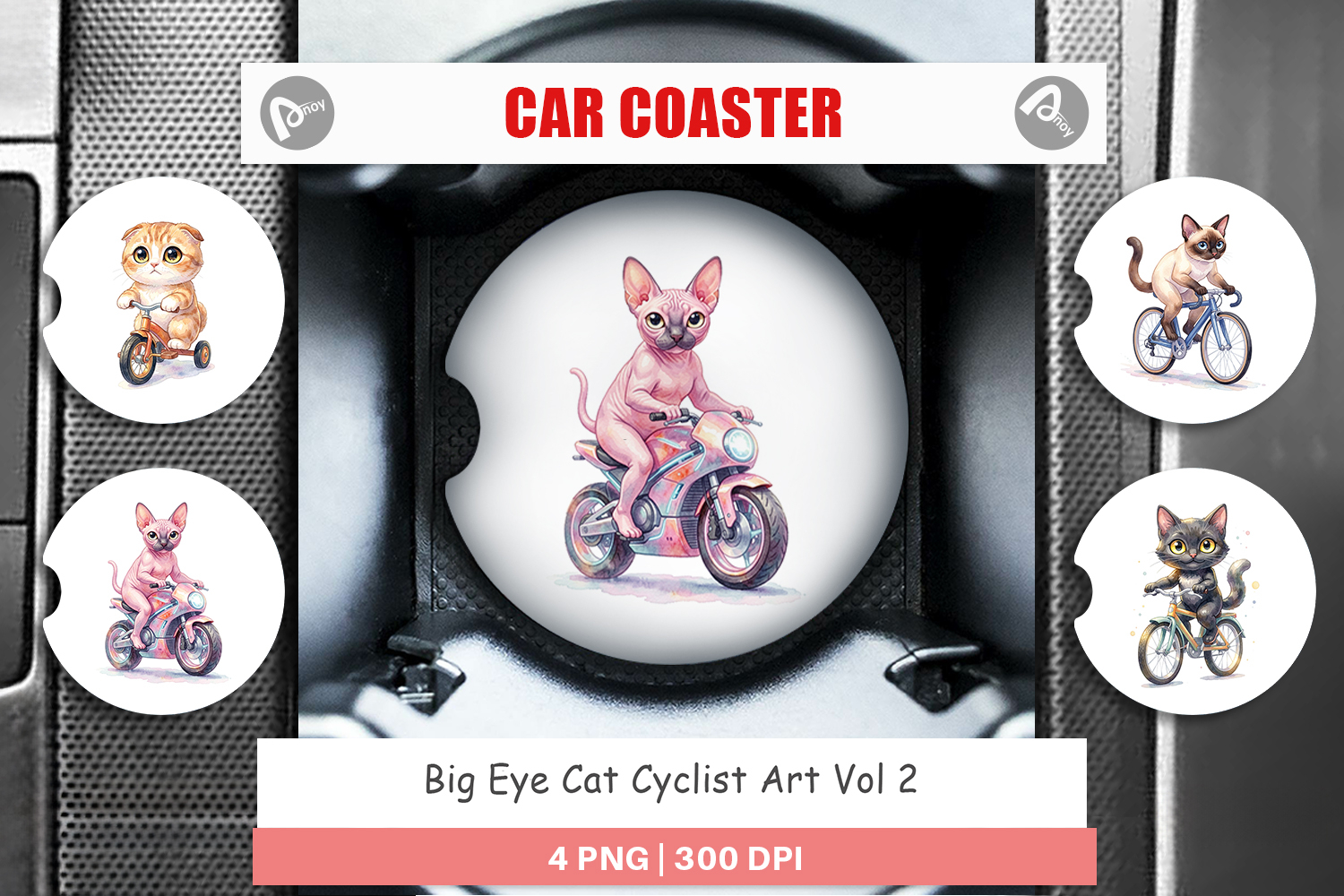 Sublimation Designs Cute Animal Art Gift For Cat Lover Car Coaster Png Car Coaster Sublimation Funny Cat Coaster Printable Gift Png Cyclist Gift Idea Big Eye Cat Art Cat Cyclist Design