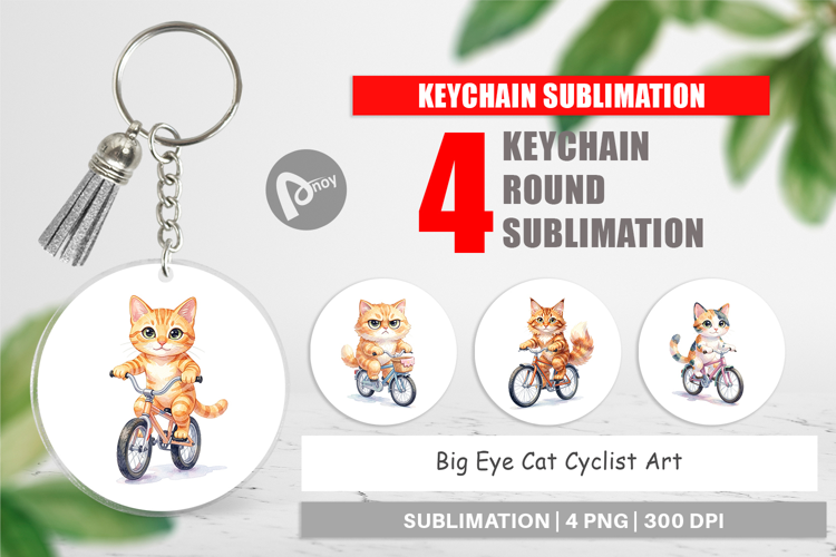 Sublimation Designs Cute Animal Art Gift For Cat Lover Keychain Sublimation Round Keychain Png Funny Cat Keychain Printable Gift Png Cyclist Gift Idea Big Eye Cat Art Cat Cyclist Design
