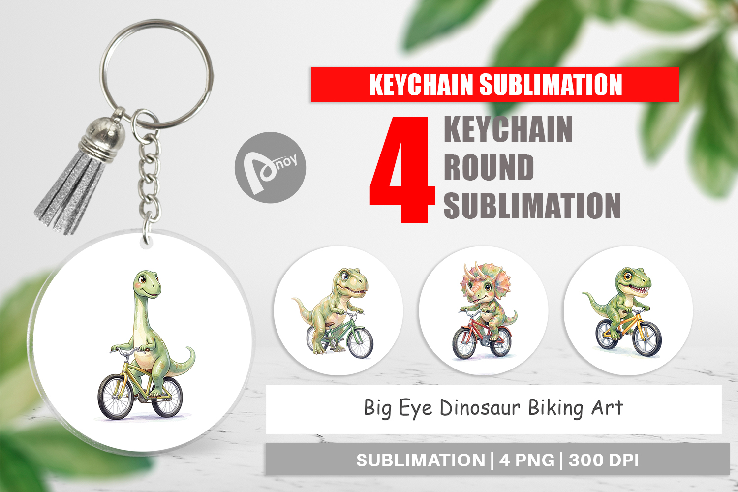 Sublimation Designs Gift For Kid Keychain Sublimation Round Keychain Png Printable Gift Png Cyclist Gift Idea Dinosaur Biking Art Big Eye Dino Design T-rex On Bicycle Funny Dino Gift