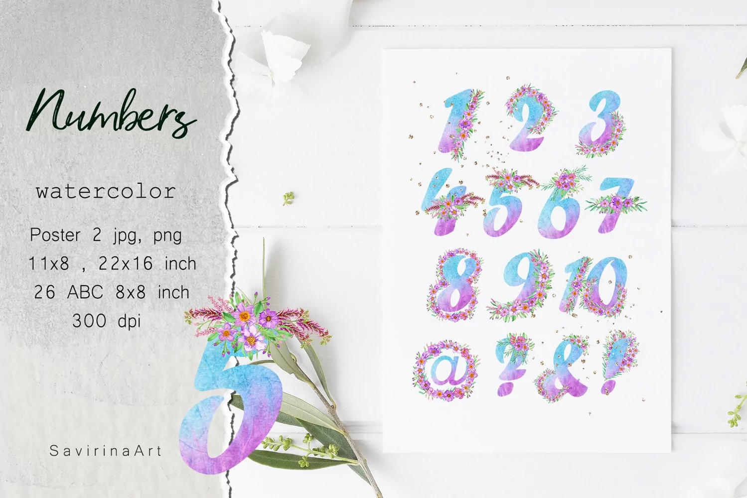Number Watercolor Flowers Card,Poster number Sublimation PNG example image 1