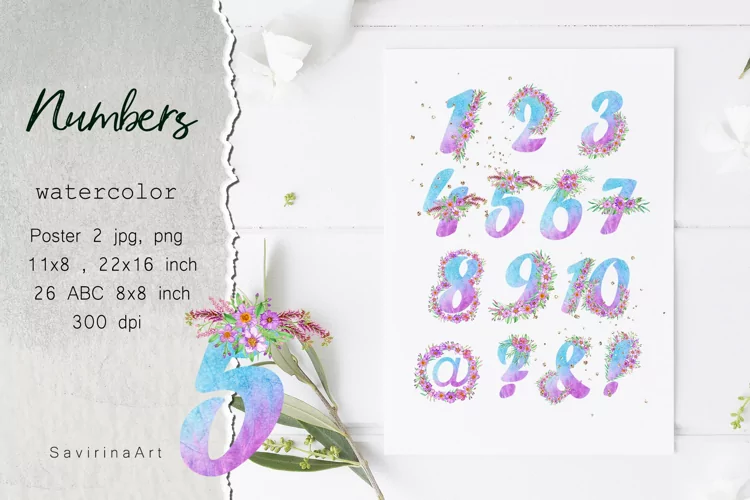 Number Flowers Card,Poster number ,Watercolor Sublimation Files ,Digital Watercolor,Instant Download,Wall Room Decor .