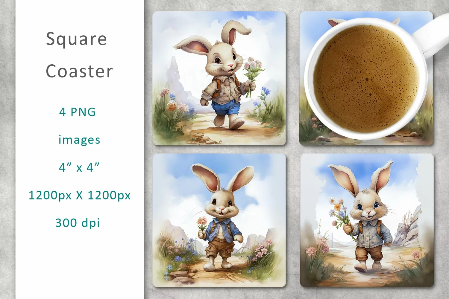 Greeting Cards Kitchen Decor Gift Tags Printable Design Digital Collage Sheet Sublimation Png Easter Coaster Square Coaster Sublimation Bunny With Flowers Square Coaster Bunny Magnets