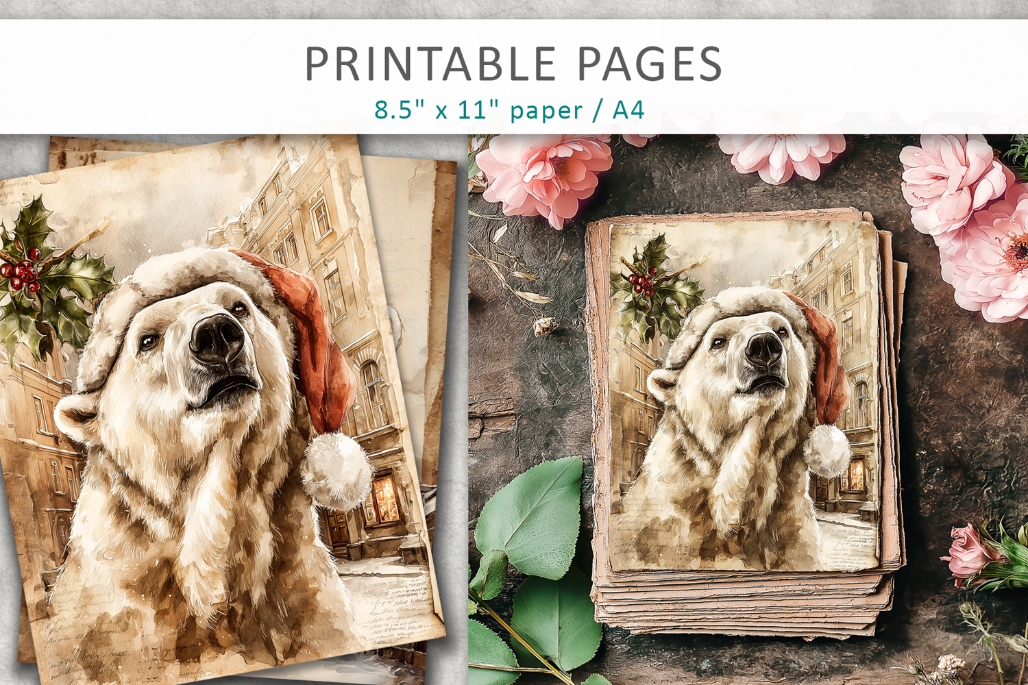 Step into the magic of a vintage Christmas with this beautiful digital paper set featuring watercolor animals and festive charm. Each page combines soft holiday tones, aged paper textures, and painterly brush details that create a cozy, nostalgic feeling — perfect for junk journals, scrapbooking, card making, or DIY holiday crafts.