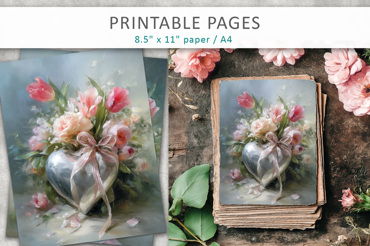 These high-quality printable floral heart pages are ideal for junk journals, scrapbooking paper, handmade greeting cards, wedding invitations, wall art, posters, calendars, home décor, collages, and DIY gifts. The soft, artistic floral style adds an elegant and romantic touch to any craft project.