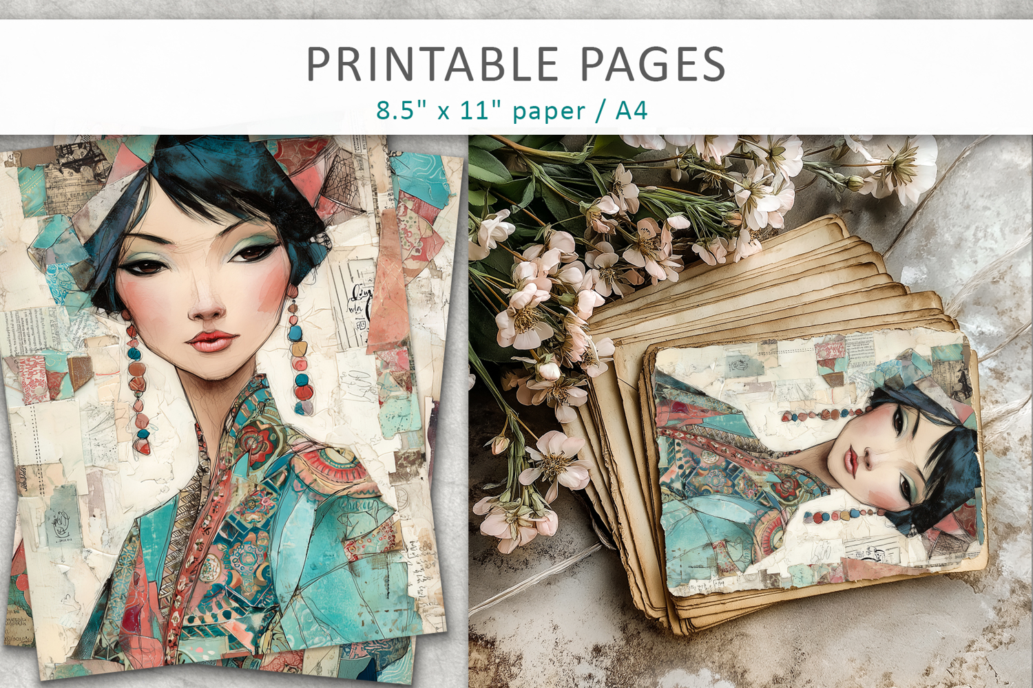 Bring your creative projects to life with this stunning collection of mixed media collage pages featuring a woman portrait. These artistic sheets combine vintage textures, layered elements, and expressive feminine imagery—perfect for adding depth and character to your creations.