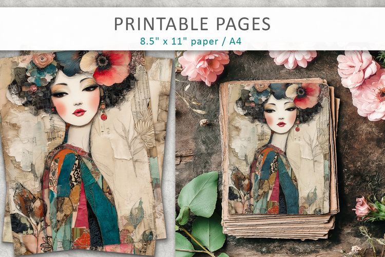 Bring your creative projects to life with this stunning collection of mixed media collage pages featuring a woman portrait. These artistic sheets combine vintage textures, layered elements, and expressive feminine imagery—perfect for adding depth and character to your creations.
