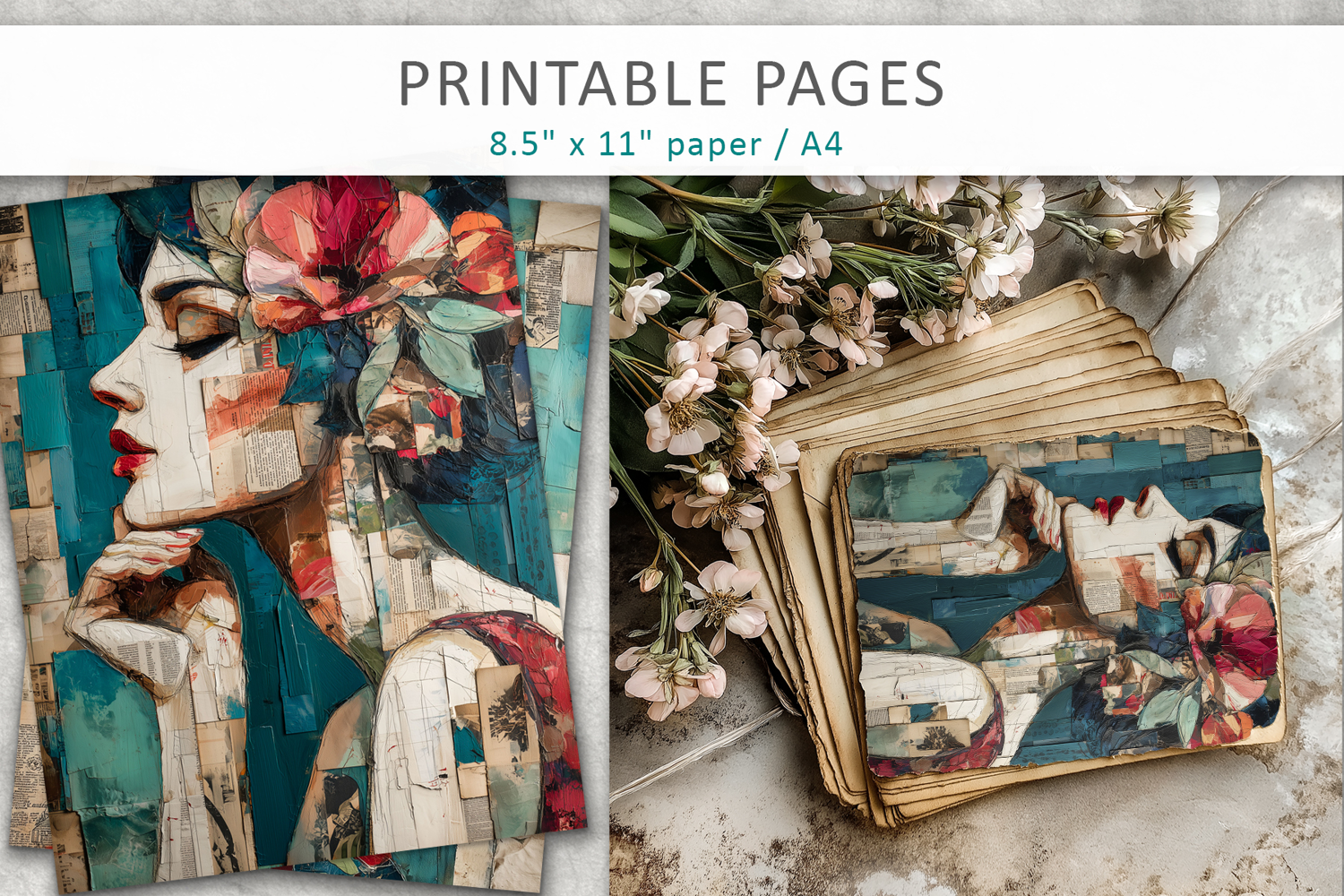 Bring your creative projects to life with this stunning collection of mixed media collage pages featuring a woman portrait. These artistic sheets combine vintage textures, layered elements, and expressive feminine imagery—perfect for adding depth and character to your creations.