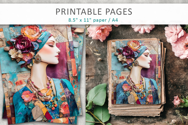 Bring your creative projects to life with this stunning collection of mixed media collage pages featuring a woman portrait. These artistic sheets combine vintage textures, layered elements, and expressive feminine imagery—perfect for adding depth and character to your creations.