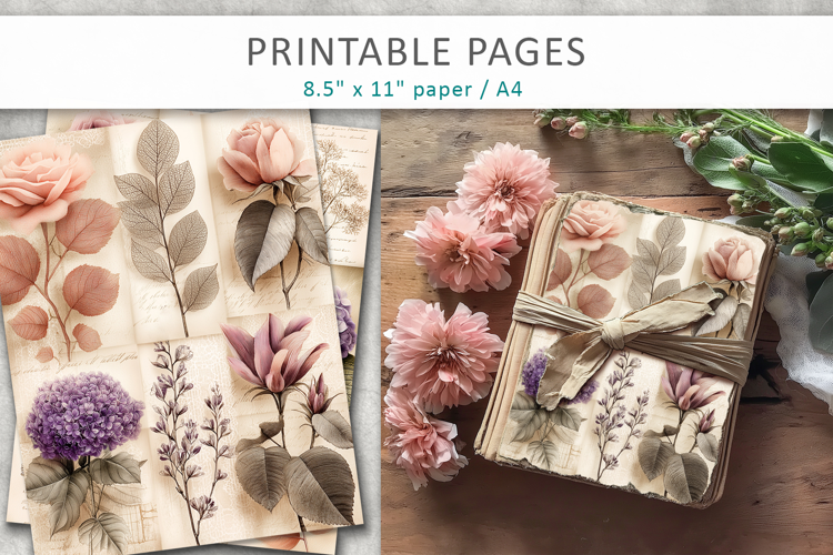 Each design is created in a harmonious pastel color palette with visible texture, giving the pages a handcrafted, antique and slightly distressed look. The mix of botanical illustrations and vintage backgrounds makes this set perfect for creating elegant and nostalgic compositions.