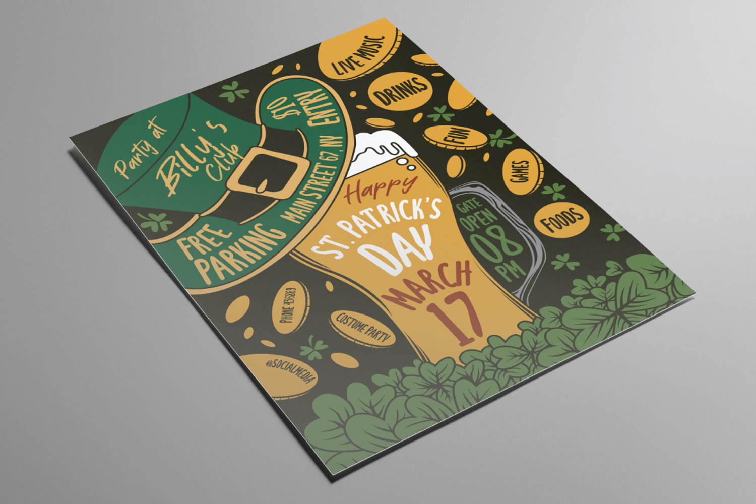Celebrate St. Patrick’s Day with a joyful flyer featuring vector illustration of a leprechaun’s hat, shamrock leaves, golden coins, and a pint of beer, all brought together with a carefully chosen font combination to create an artistic and unified flyer design.