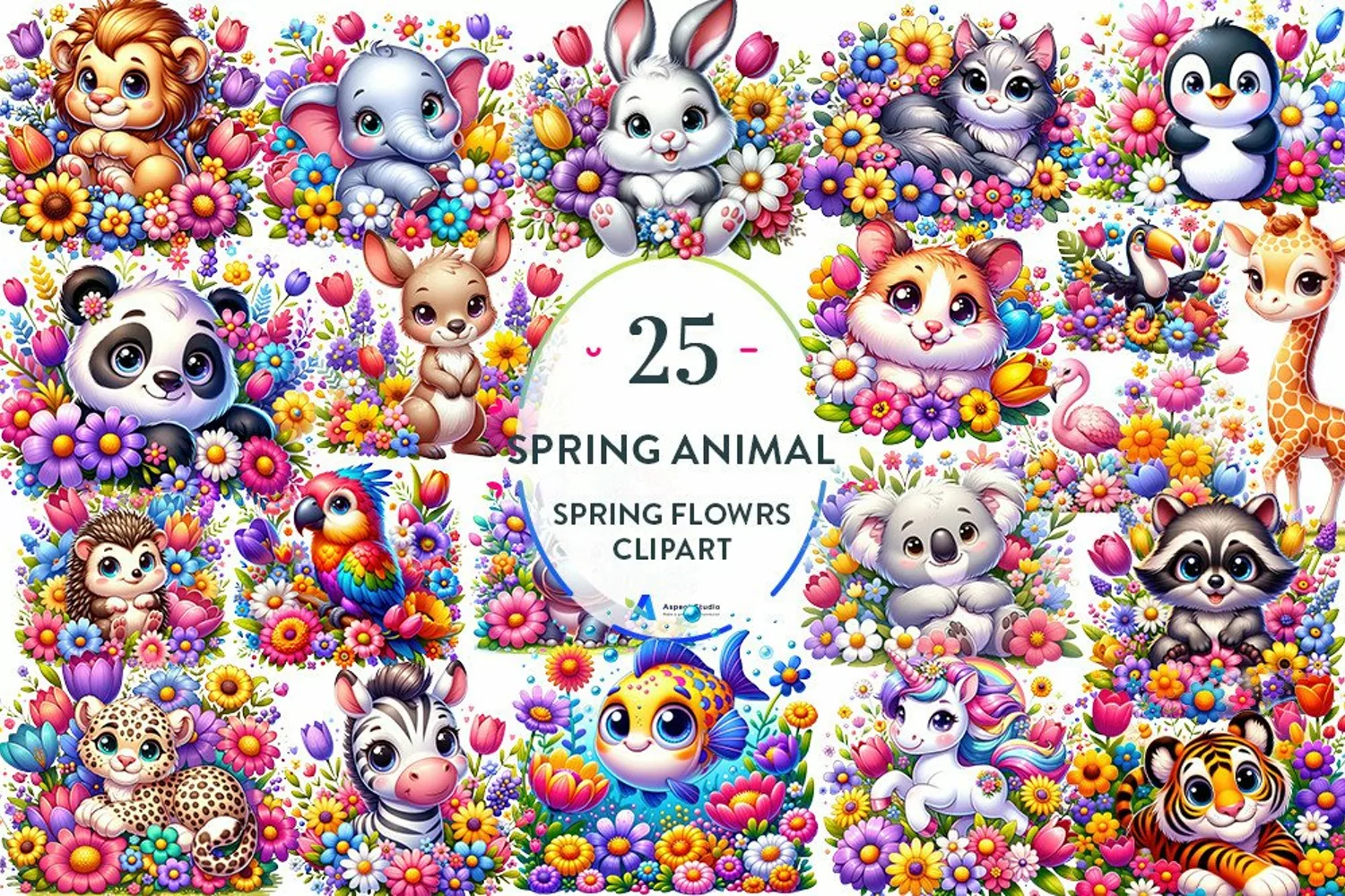 Whimsical Watercolor Clipart Instant Download Digital Download Cute Baby Animals Colorful Flowers Spring Sublimation Floral Animals Spring Floral Animals Spring Floral Animals Clipart