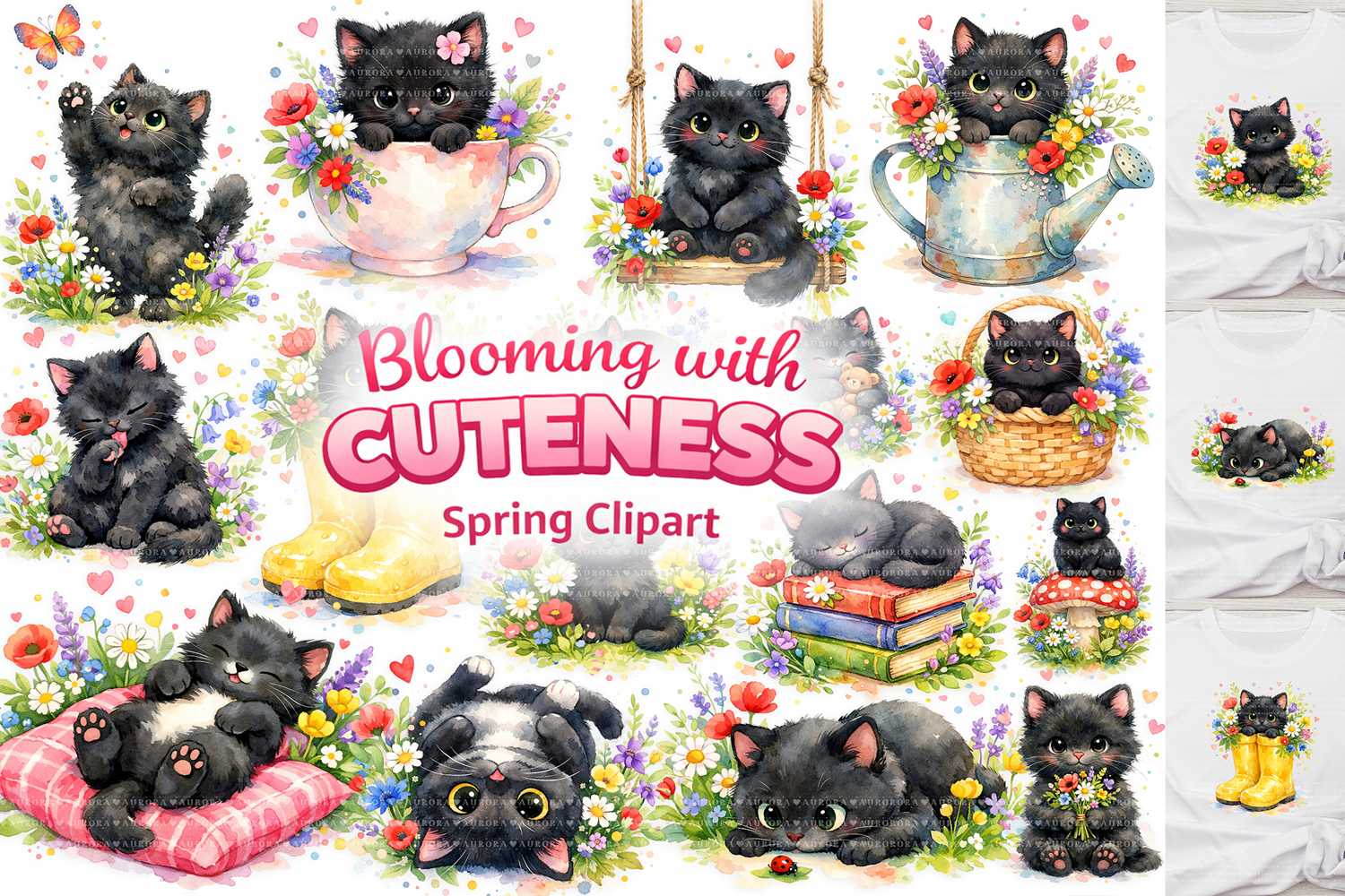 Nursery Clipart Cute Kitten Clipart Black Cat Clipart Watercolor Cat Png Floral Kitten Png Cat Sublimation Png Printable Cat Art Spring Png Bundle Black Kitten Png Spring Cat Clipart
