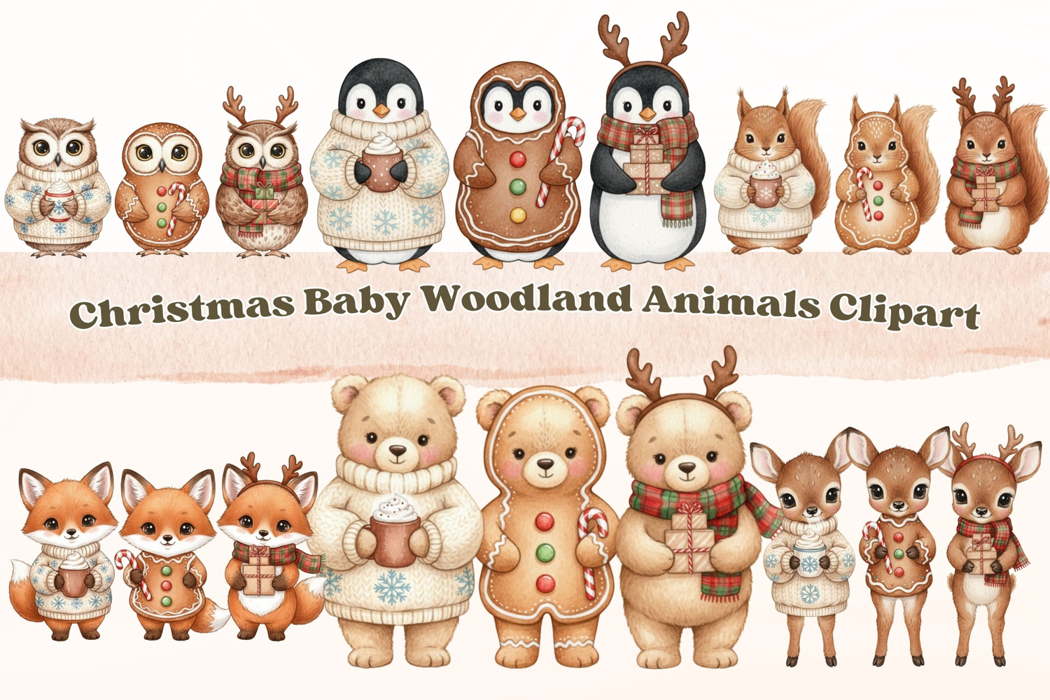 This Christmas Baby Woodland Watercolor Animals Clipart Bundle includes a charming collection of hand-drawn watercolor illustrations featuring adorable winter creatures such as squirrels, foxes, owls, penguins, bears, and deer. Each character is illustrated in a cozy, festive holiday style with sweaters, scarves, cocoa mugs, gifts, gingerbread outfits, and other warm Christmas details.