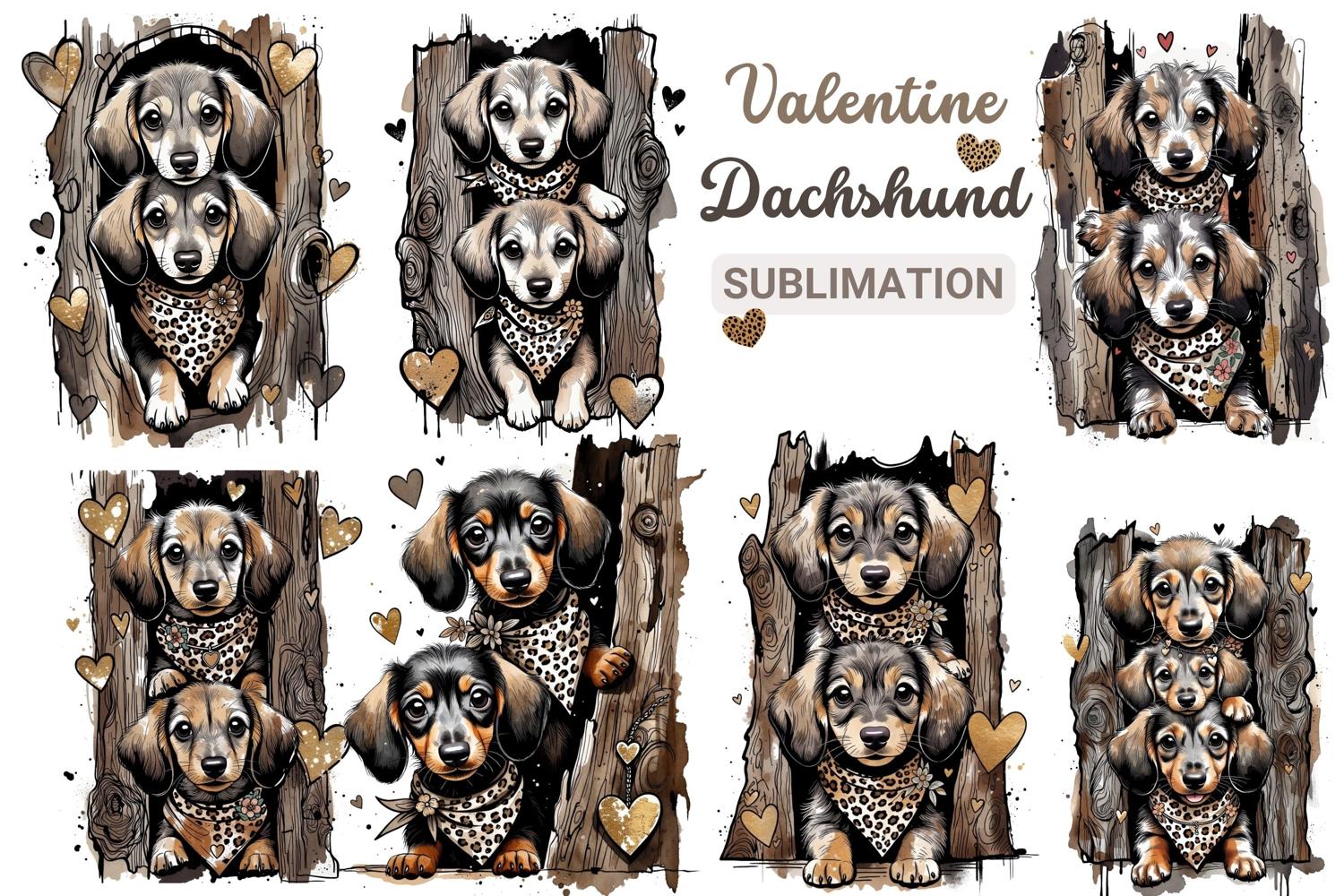 Valentine Dachshund T-shirt Design Tattoo Flash Valentine Dogs Baby Dachshund Sticker Png Leopard Bandana Puppy Valentine Gold Foil Dog Valentine Watercolor Dachshund Trio Rustic Valentine Dog Illustration Boho Valentine Puppy Art Grunge Valentine Dog Print Heart Charm Dachshund Clipart