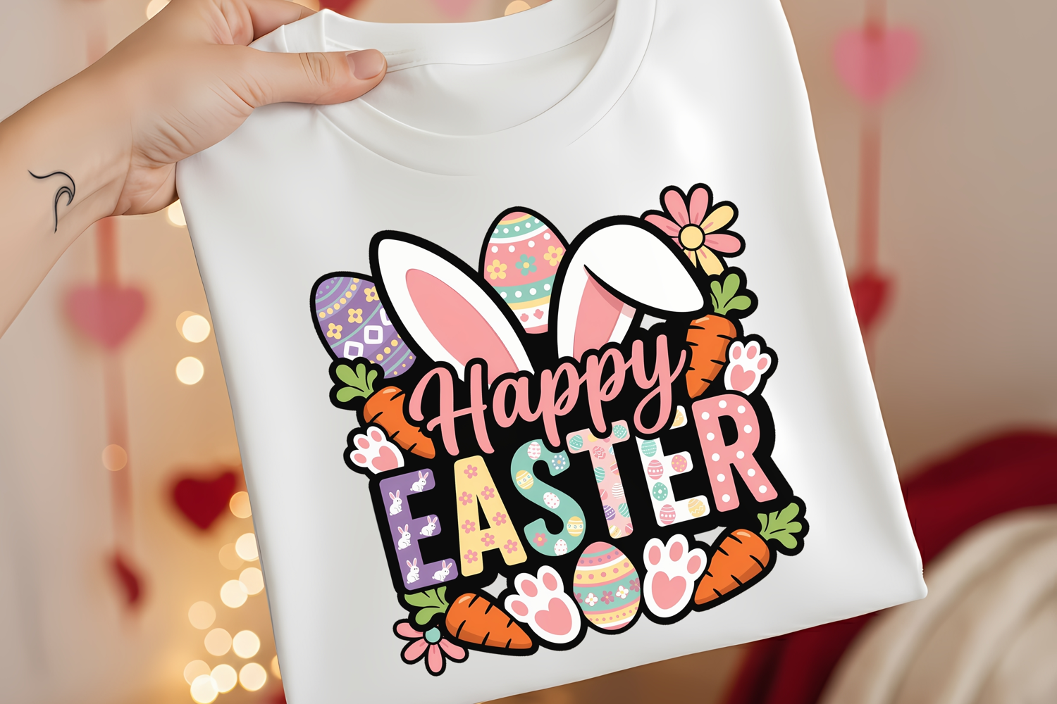 A vibrant spring-themed Happy Easter design featuring playful pastel block letters, flowing pink script, oversized bunny ears, decorated eggs, carrots, daisies, and cute paw prints — all outlined in bold black for a trendy sticker-style look. Perfect for t-shirt printing, sublimation, stickers, tote bags, mugs, and Easter crafts.