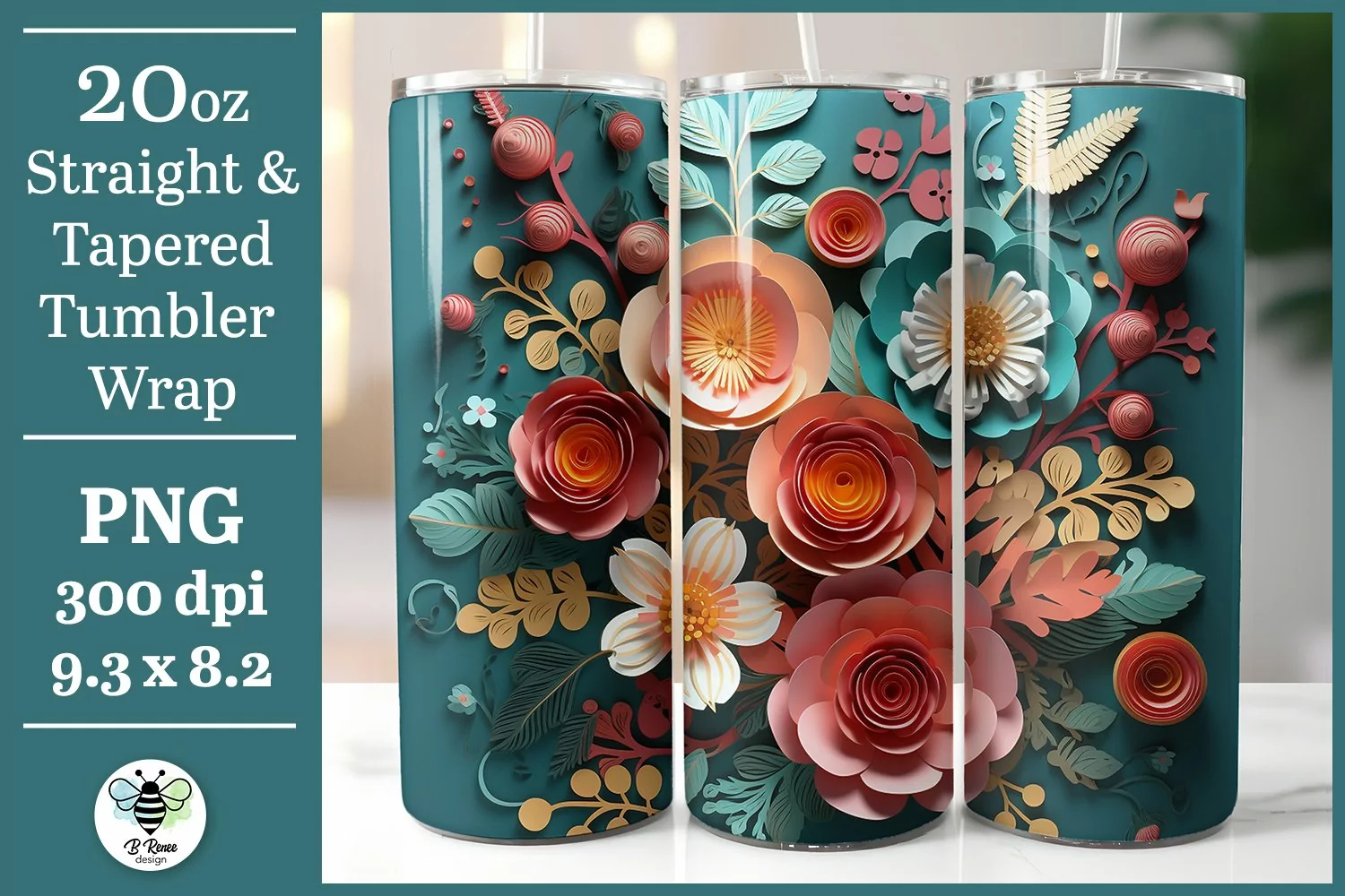 Make a pretty fall tumbler with this 3D teal and pink floral wrap. This design is included for both straight and tapered 20oz tumbler wraps.