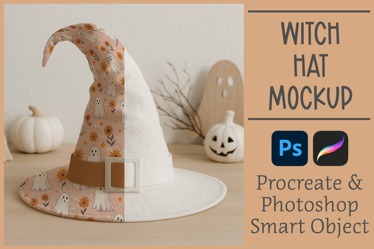 Halloween mockup of a witch hat to showcase surface pattern designs. Photoshop smart object mockup and Procreate mockup.