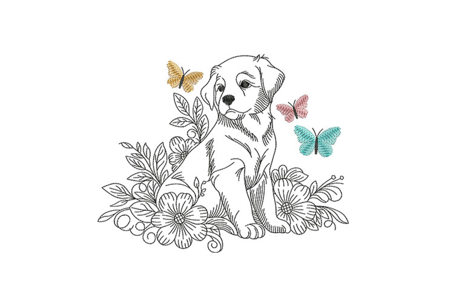 Puppy with Butterflies and floral Embroidery Design – Machine Embroidery File