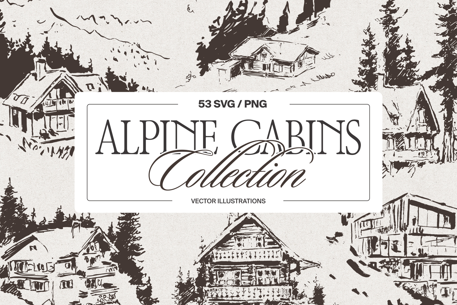Hand-drawn vector illustrations of Alpine cabins, created with two artisanal techniques. Expressive ink and soft pencil sketching. Each piece depicts traditional Swiss chalets, snow-covered peaks, and serene pine forests, capturing the timeless charm of authentic Alpine architecture.