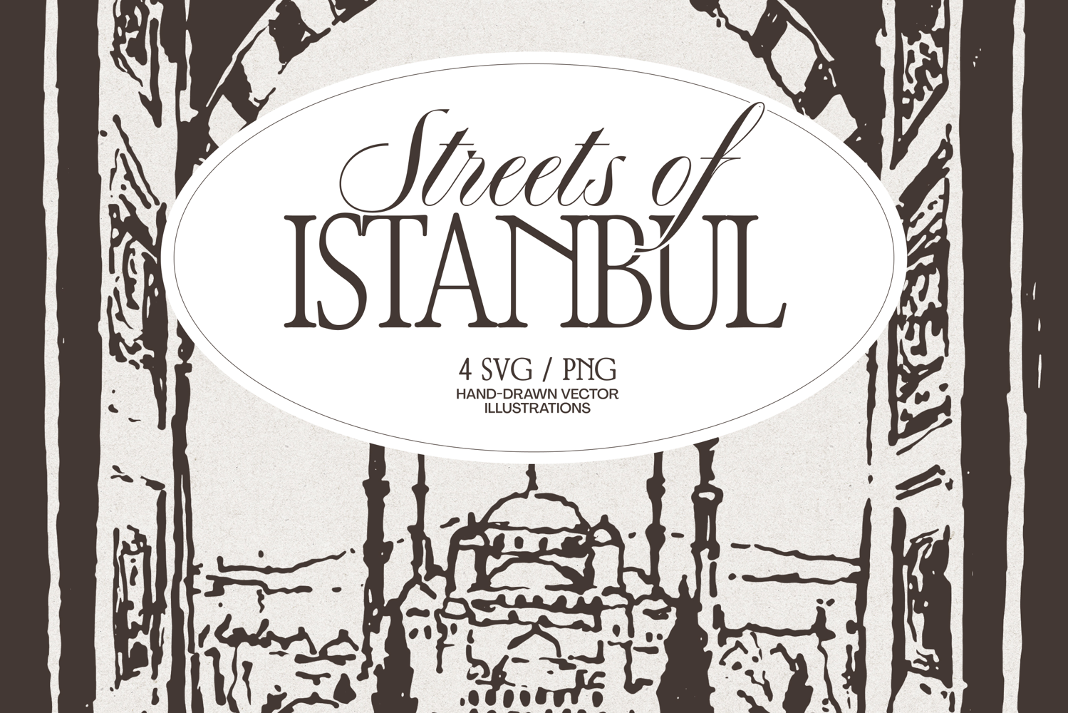 Hand-drawn Istanbul vector illustrations created with the warmth and precision of real human sketching. Each artwork captures the spirit of the city, the Blue Mosque seen through elegant archways, the wide Bosphorus with shining minarets, the lively rhythm of traditional streets, and the calm beauty of Ottoman architecture.