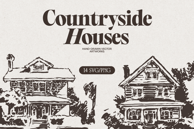 Authentic hand-drawn countryside house vector illustrations crafted with traditional pen-and-ink sketching techniques, showcasing vintage cottage architecture and rustic residential charm with organic line work and artistic detail.