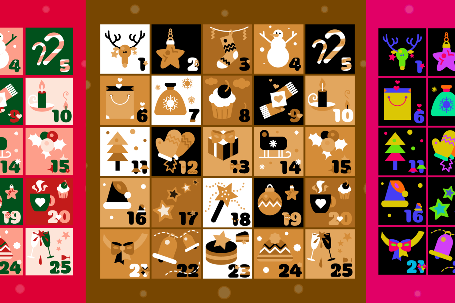 Create warm and magical holiday designs with this Boho Advent Calendars collection, featuring three unique styles in one pack. This set includes a traditional green and red version, an elegant gold version, and a bold neon version, giving you versatile options for both classic and modern Christmas projects.
