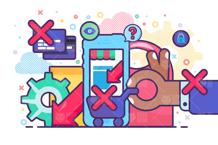 Illustrate reduced consumer activity and retail slowdown with this conceptual illustration featuring a downward arrow, online shop app interface, empty paper shopping bags, gear symbolizing business processes, and a crossed hand holding a shopping cart representing purchase cancellation or restriction. Ideal for e-commerce articles, retail analytics, financial reports, market research, business presentations, and editorial content. Clean modern illustration style ensures clear messaging for digital and print use.