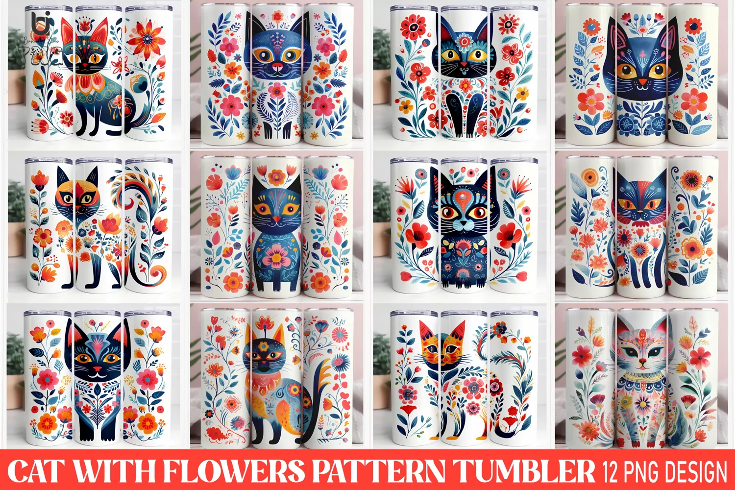 Cat with Flowers Pattern Sublimation Tumbler Design example image 1