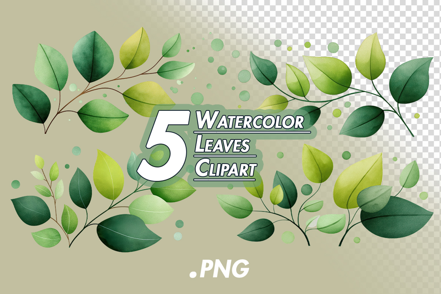 Soft watercolor painting showcases diverse green leaves with varying shapes and sizes, ideal for nature-themed designs.