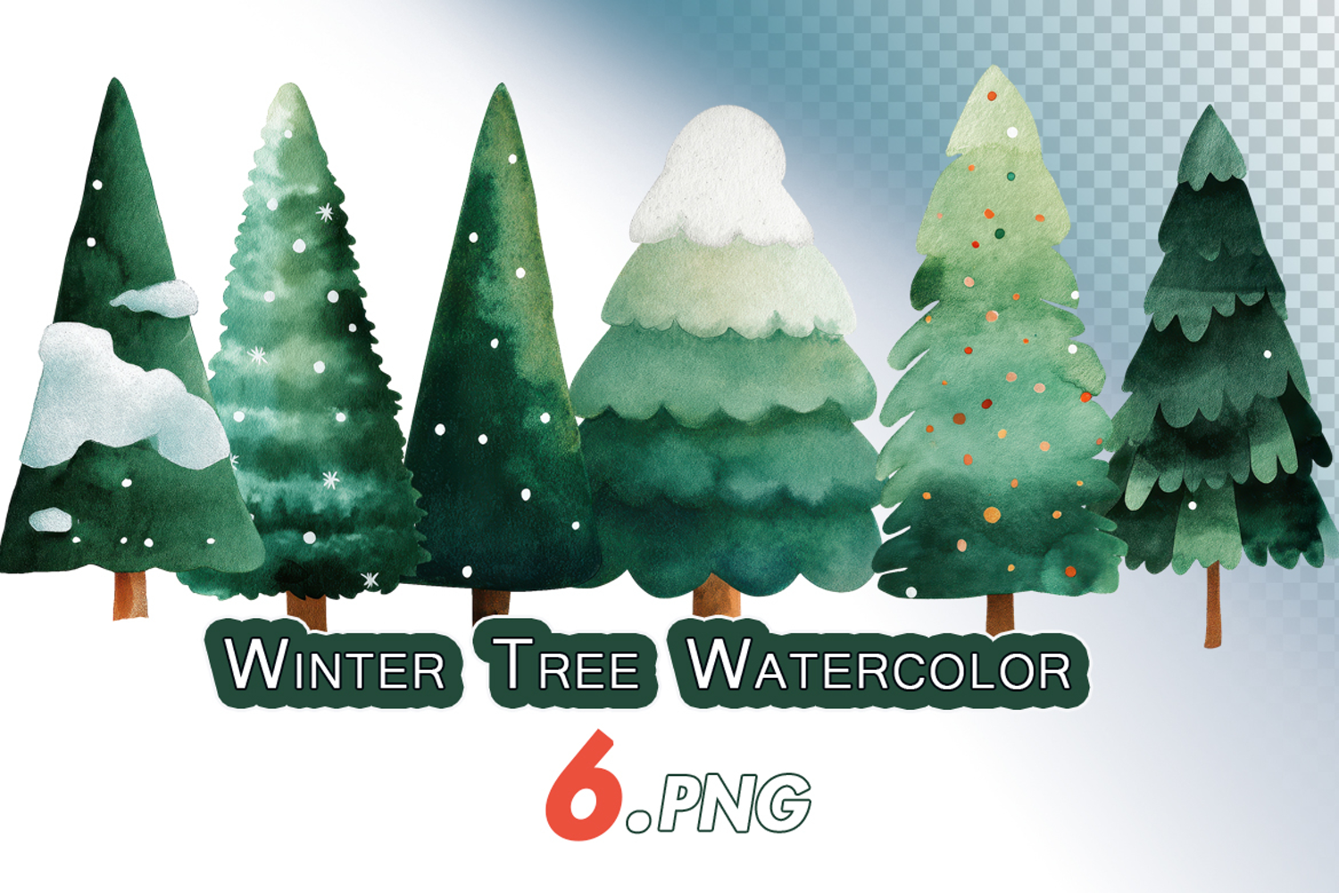 A set of watercolor trees captures winter vibes with greens and snow, ideal for festive designs.