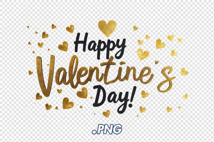 Display of Happy Valentine's Day with golden hearts on a clear background suitable for celebrations and events.
