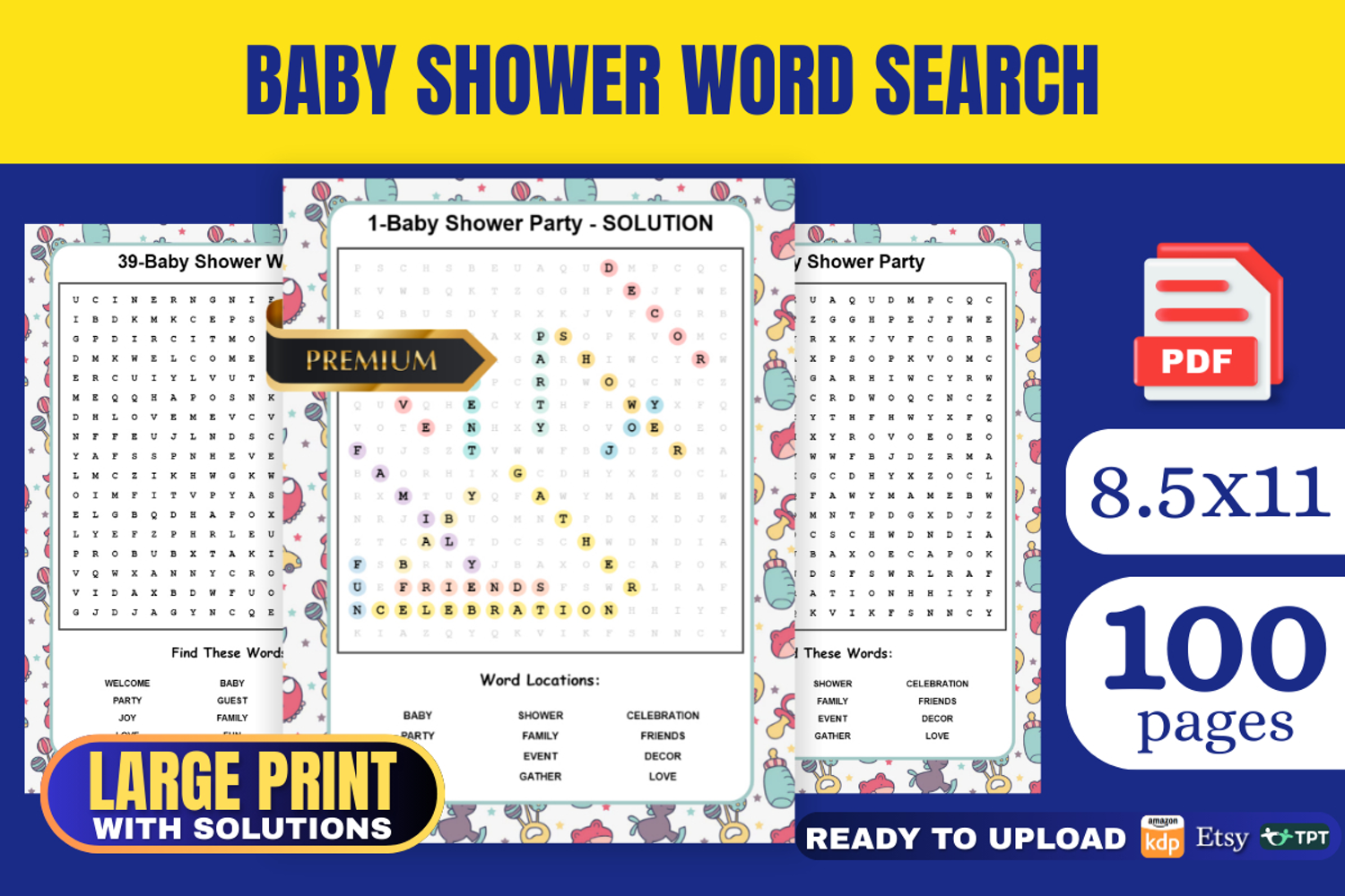 • 100 Pages total – 50 Unique Baby Shower Themed Puzzles + Full Solutions