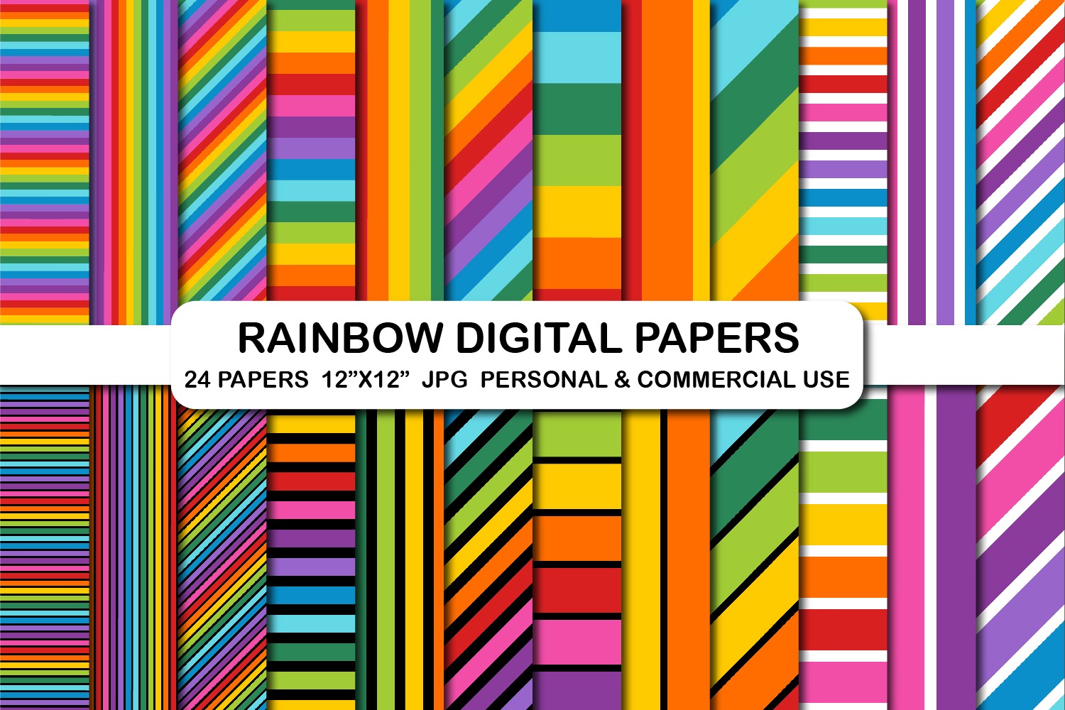 24 Rainbow Stripes Digital Papers Set, Unicorn Rainbow Paper