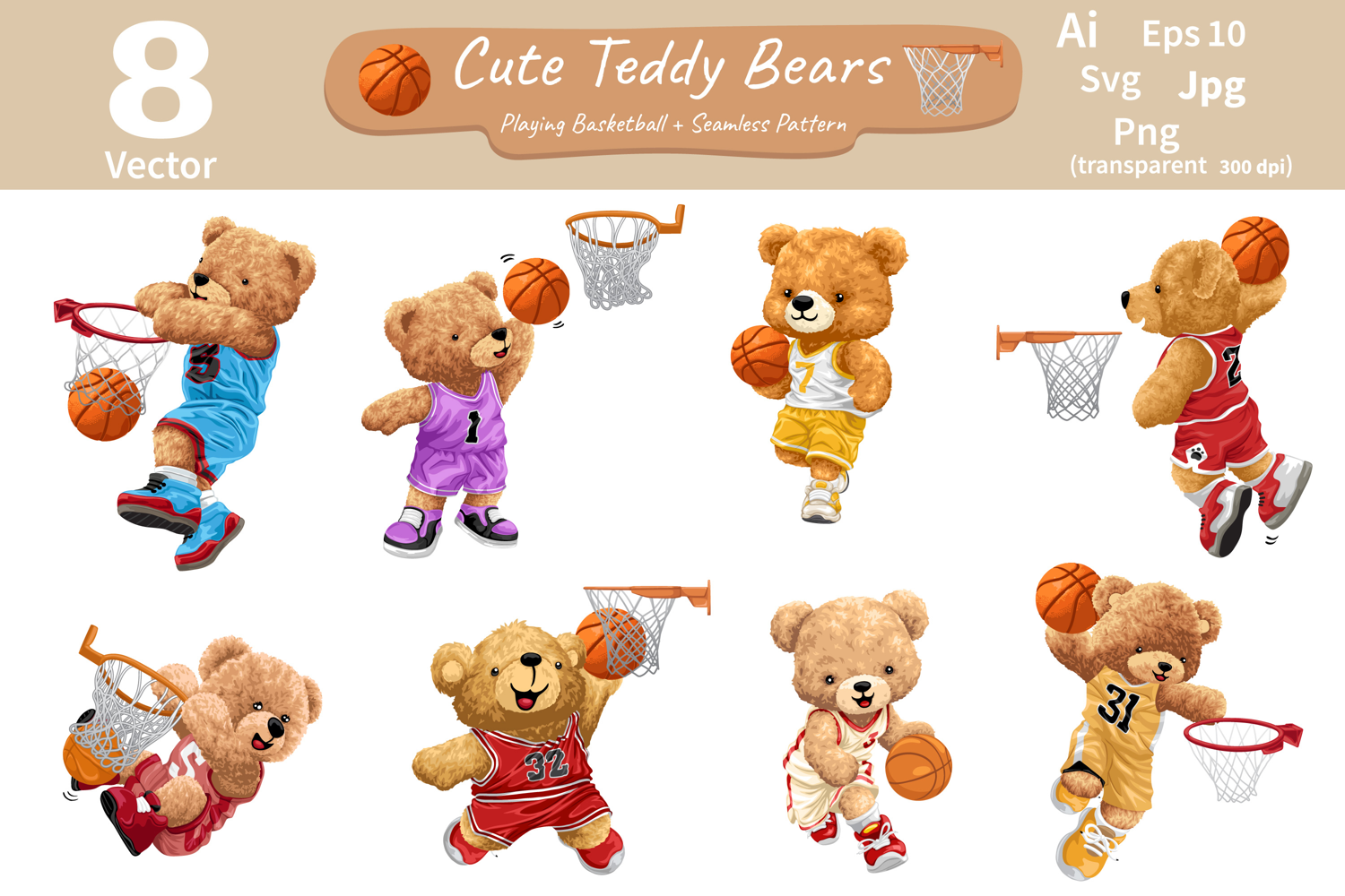 This collection also includes a seamless basketball pattern featuring teddy bears,