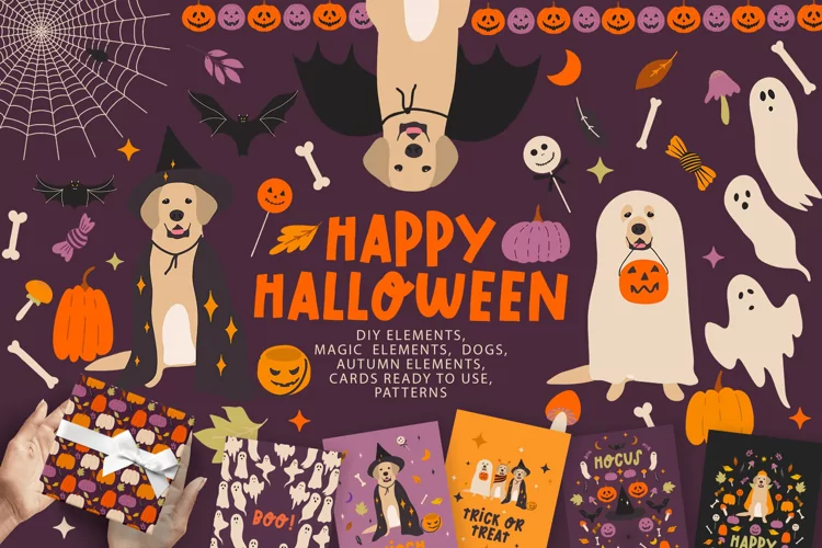 NEW design set filled individual elements, magic elements, dogs, autumn leaves, seamless pattern, cards, compositions ready to use... Be sure to click on the image to see all elements.
