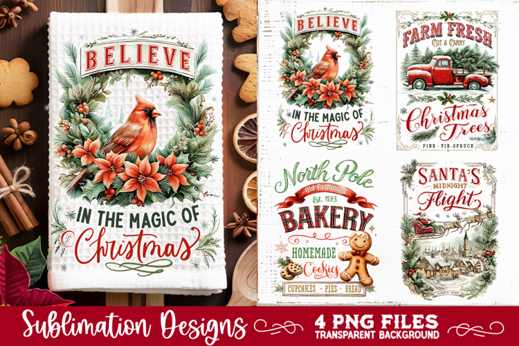 Vintage Christmas Sublimation Christmas Towel Sublimation Festive Kitchen Towel Png Christmas Trees Towel Print Holiday Kitchen Decor Png Retro Holiday Baking Towel Santa Sleigh Ride Clipart North Pole Bakery Png Farm Truck Christmas Design Believe Cardinal Sublimation