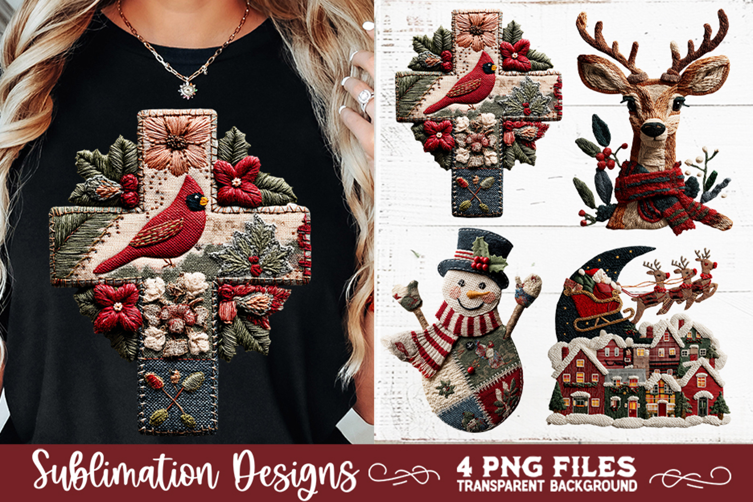 Rustic Christmas Patchwork Sublimation Designs – Cross with Cardinal, Reindeer, Snowman & Santa Sleigh PNGs for Holiday Apparel & Décor