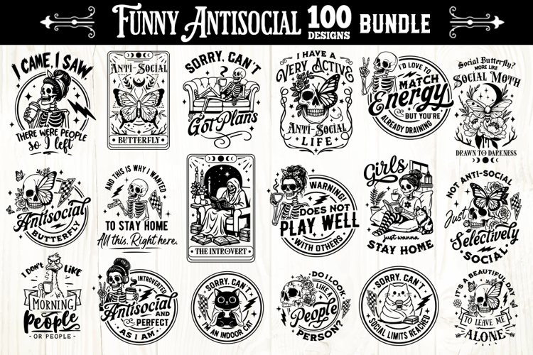 Bring bold humor and unapologetic introvert energy to your projects with this Funny Antisocial Skeleton SVG Bundle. Featuring sarcastic quotes, dark humor typography, and expressive skeleton illustrations, this collection is perfect for creators who love witty, antisocial, and slightly rebellious designs.