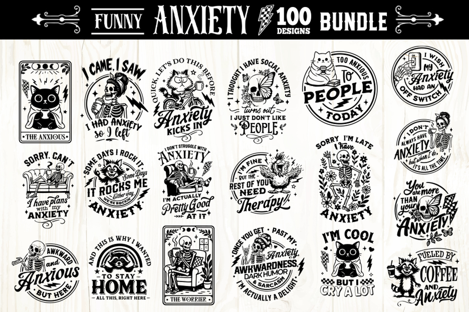 Express anxiety with honesty, humor, and a touch of dark wit with this Funny Anxiety SVG Bundle. This collection features sarcastic quotes, expressive skeletons, nervous creatures, and bold typography that perfectly capture the everyday chaos of overthinking, overstimulation, and anxious thoughts — all wrapped in humor you can laugh at.