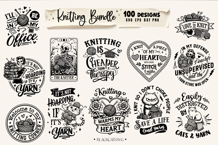 Each design is created in a clean black-and-white, hand-illustrated style that works perfectly for vinyl cutting, sublimation, laser engraving, and print projects. From relatable yarn jokes to heartfelt knitting quotes, this bundle is ideal for apparel, mugs, tote bags, wall signs, stickers, and handmade gifts for yarn lovers.