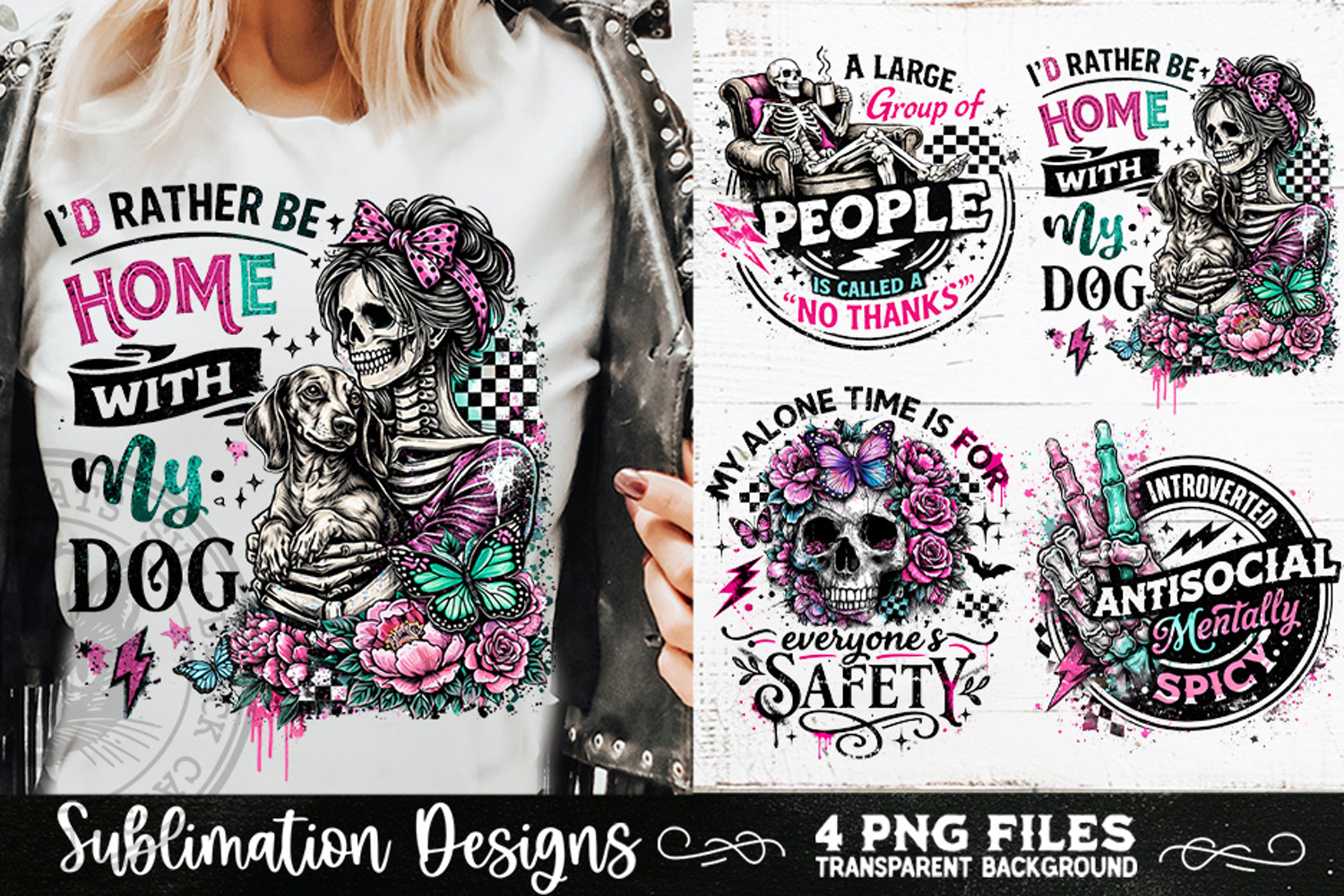 This bold and humorous sublimation design set features edgy skeleton illustrations, sassy quotes, and vibrant pink accents combined with black and teal details. Perfect for introverts, sarcastic personalities, and anyone who runs on coffee and low social battery.