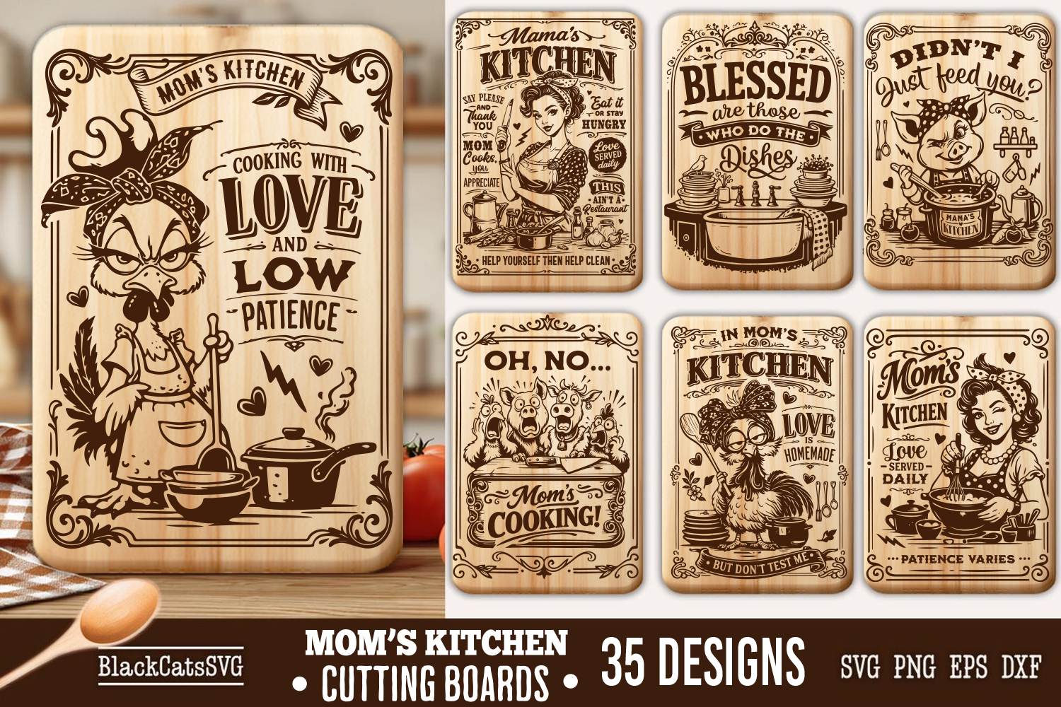 Funny Mama's Kitchen Cutting Board SVG Bundle 35 designs – Rustic Cooking Quotes, Farmhouse Humor & Engraving Designs
