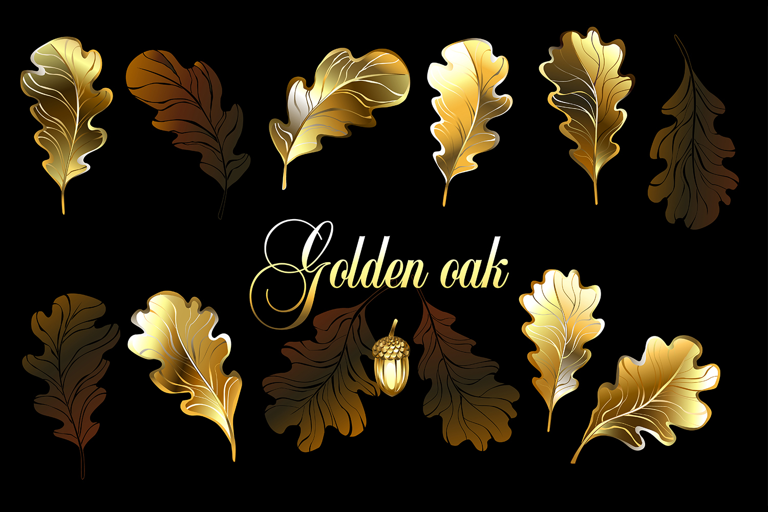Set of jewelry, quality, sparkling, shiny, golden and bronze acorns and oak leaves on black background. Golden oak.