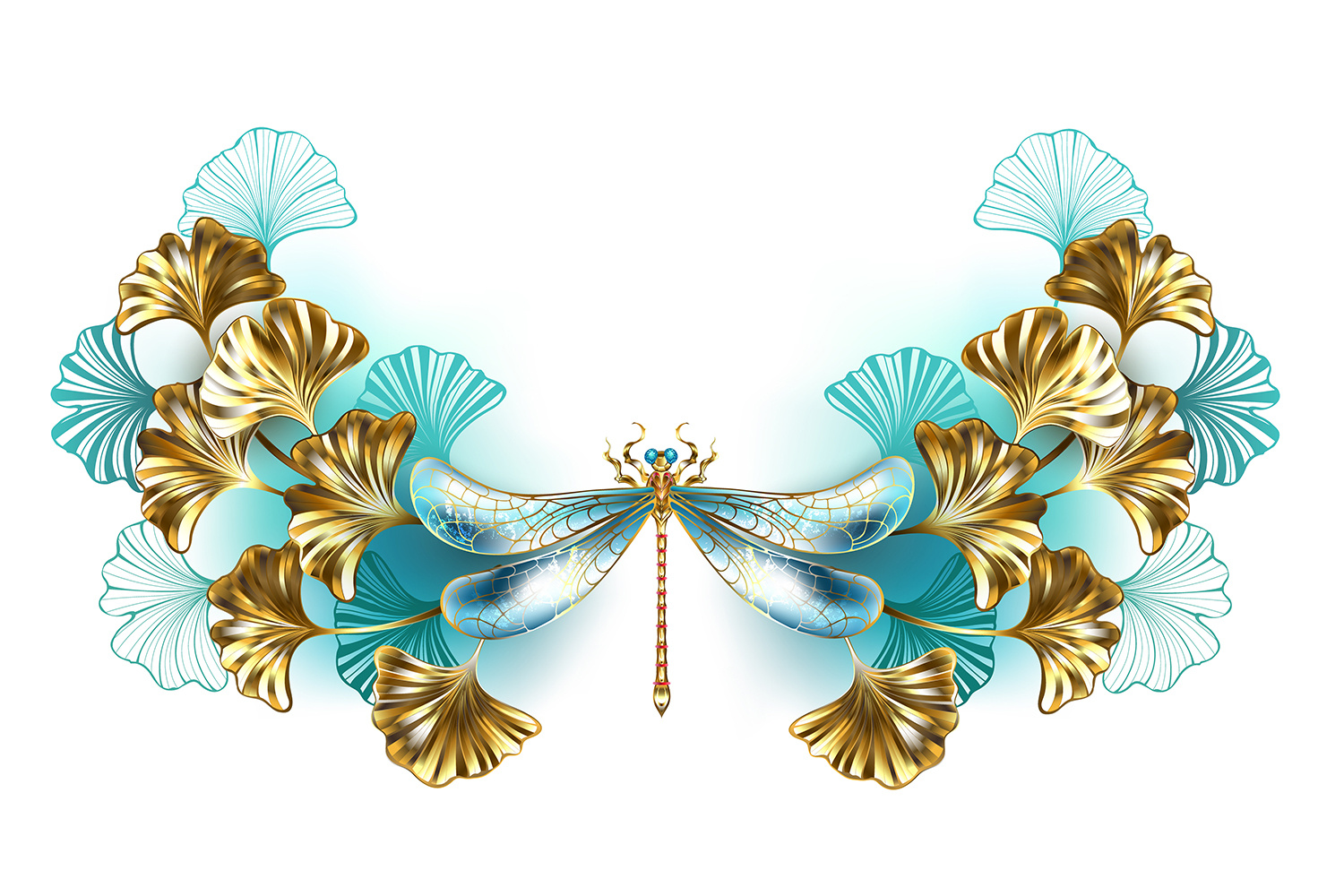 Symmetrical frame of Ginkgo biloba branches with gold and turquoise leaves, decorated with gold jewelry dragonfly on white background. Golden dragonfly.