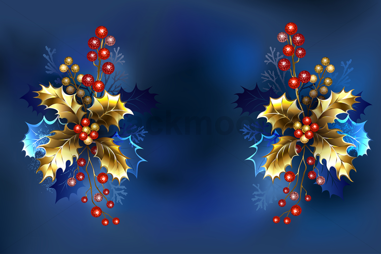 Symmetrical composition of golden, glittering, jewelry holly, sprigs of red winter berries, and ilex on cool blue background.