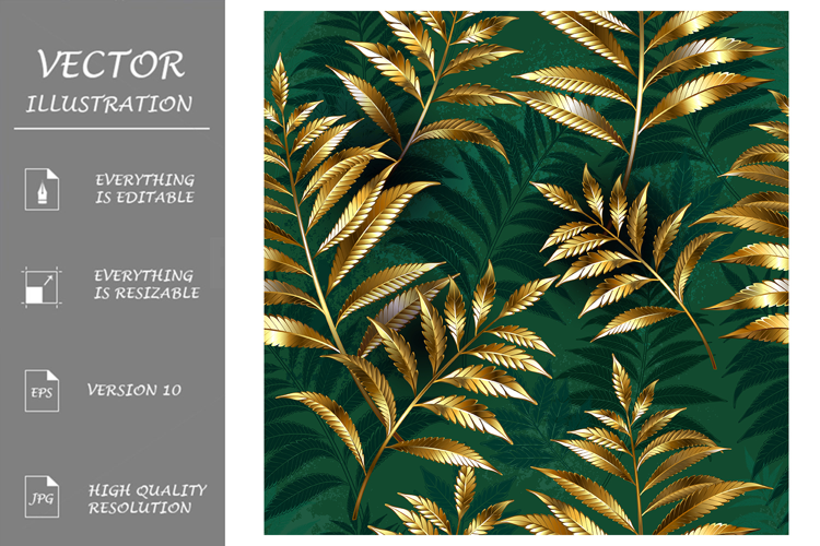 Seamless pattern of gold, jewelry, shiny fern branches and leaves on green, woodland, textured background. Golden fern.