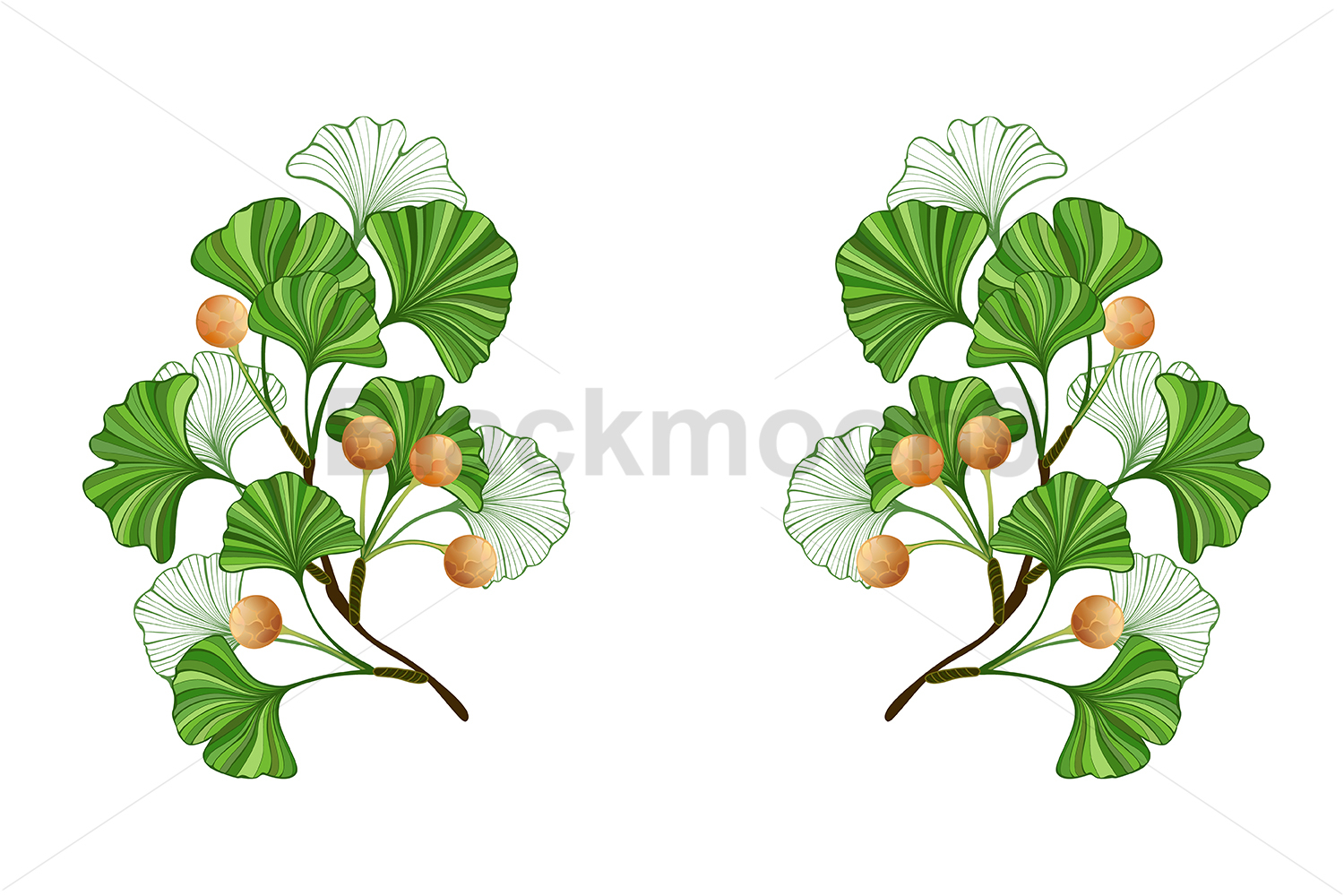 Symmetrical composition of green, artistically drawn ginkgo biloba branches with green leaves and yellow berries, on white background. Green Ginkgo Biloba.