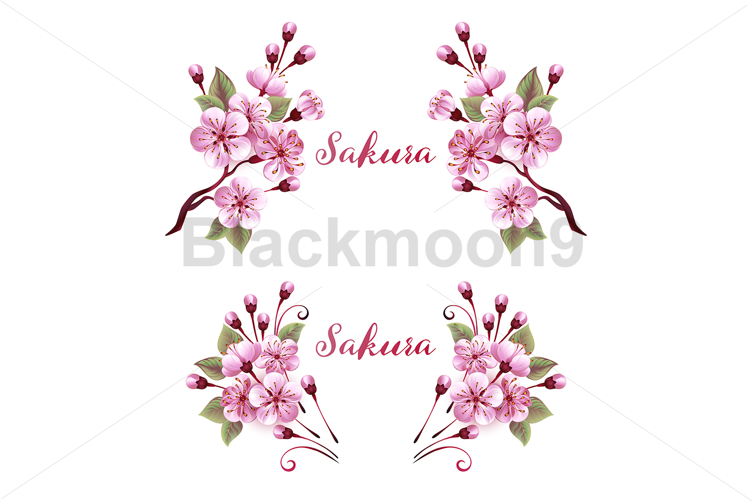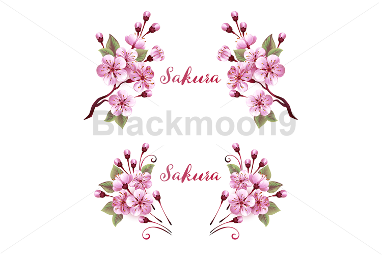 Two floral monograms of pink, lushly blooming spring sakura on white background. Pink Japanese cherry blossoms.